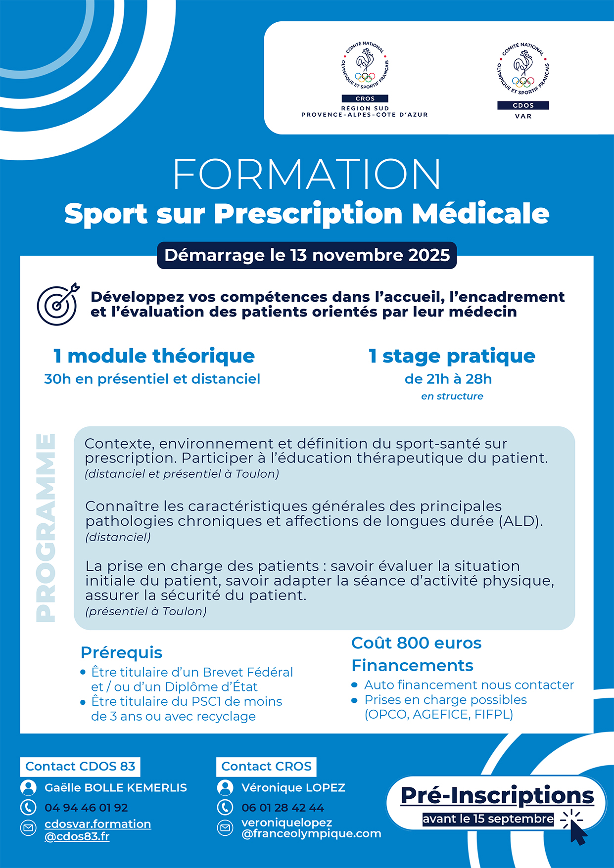 Pour toute demande sur cette formation, vous pouvez nous contacter par téléphone au 04.94.46.01.92 (demandez Gaëlle Bolle Kemerlis ou Lucie Pascal) ou par mail à cdosvar.formation@cdos83.fr.