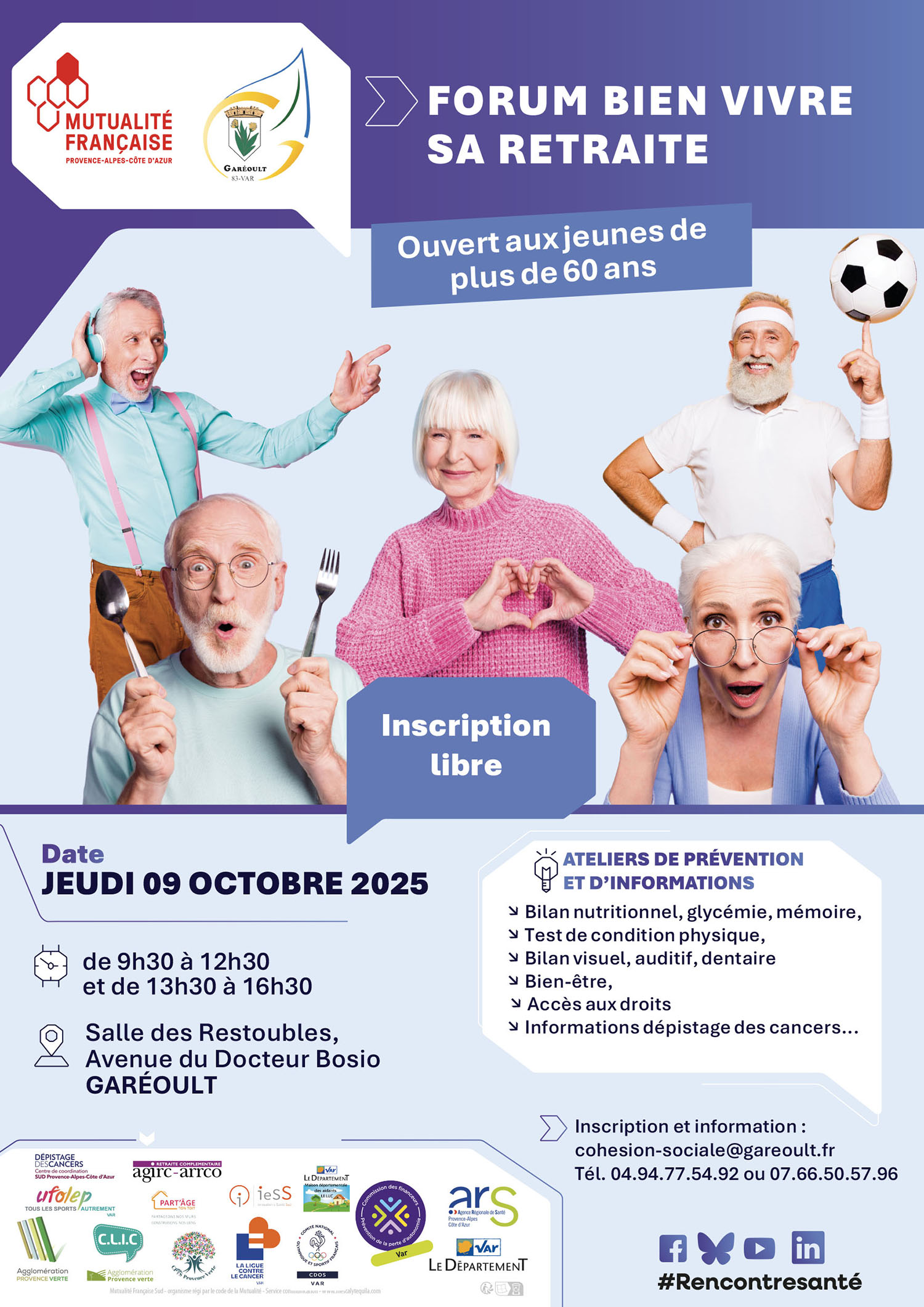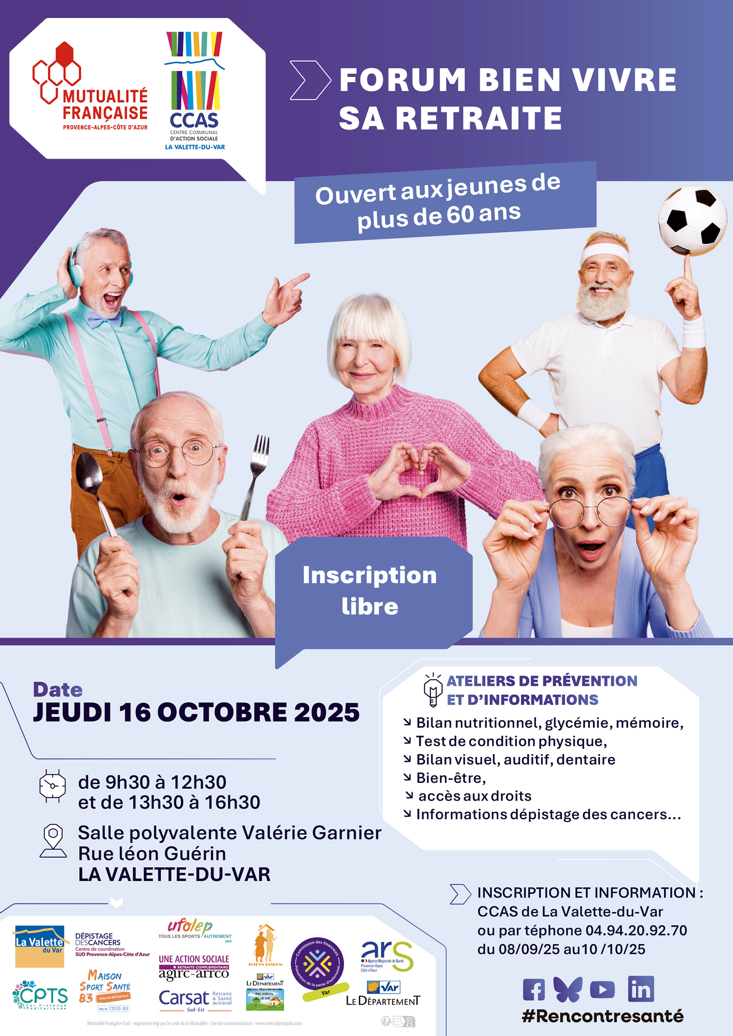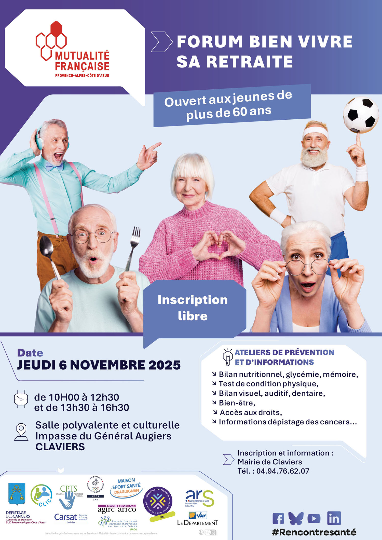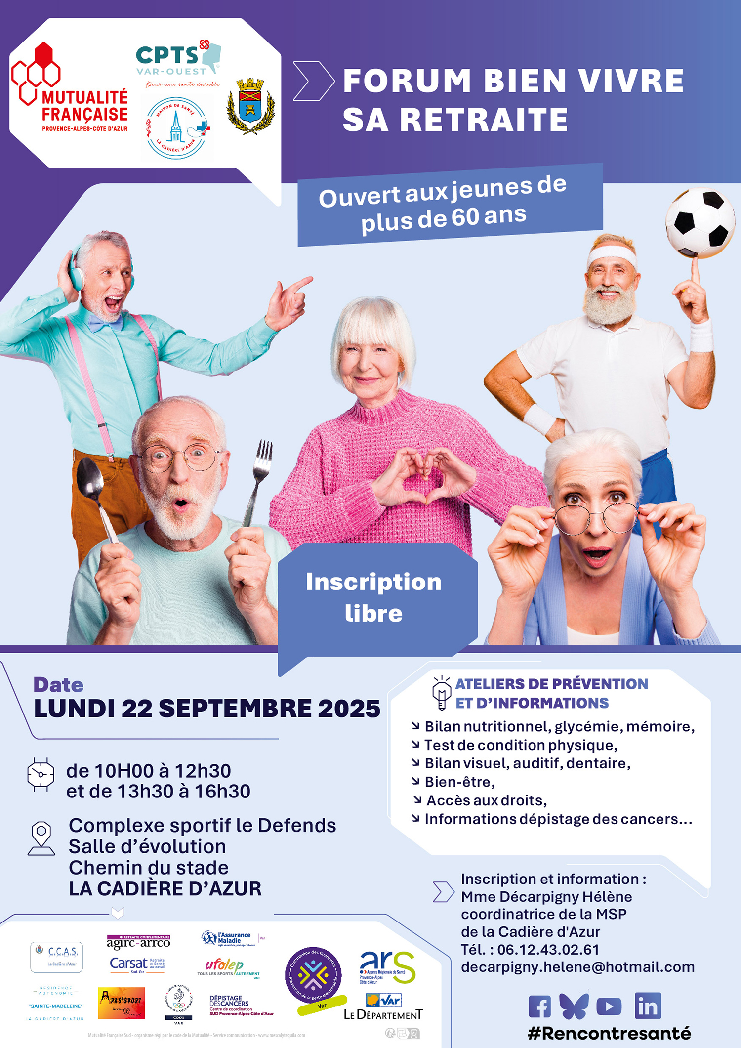 * Stands au programme des forums "Bien vivre sa retraite" : stand dépistage auditif ; stand dépistage optique ; bilan dentaire ; bilan des habitudes alimentaires ; test de condition physique ; test glycémique ; test mémoire ; stand d'accès aux droits et ouverture de votre "Espace Santé".
