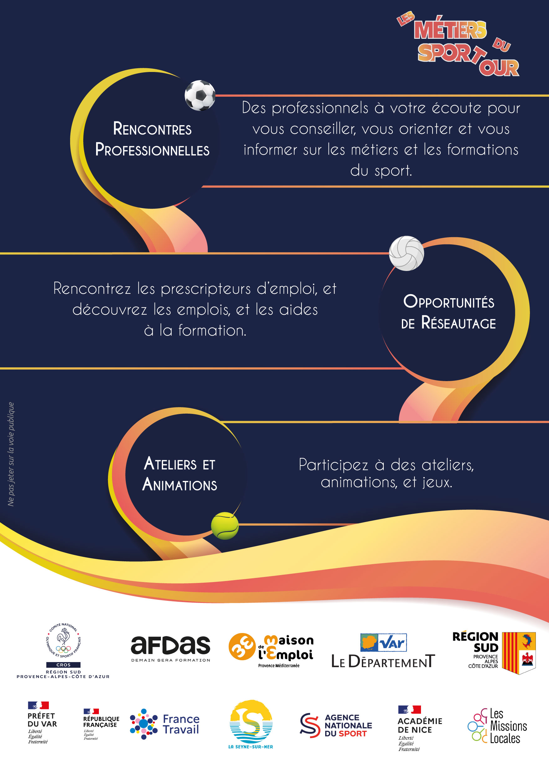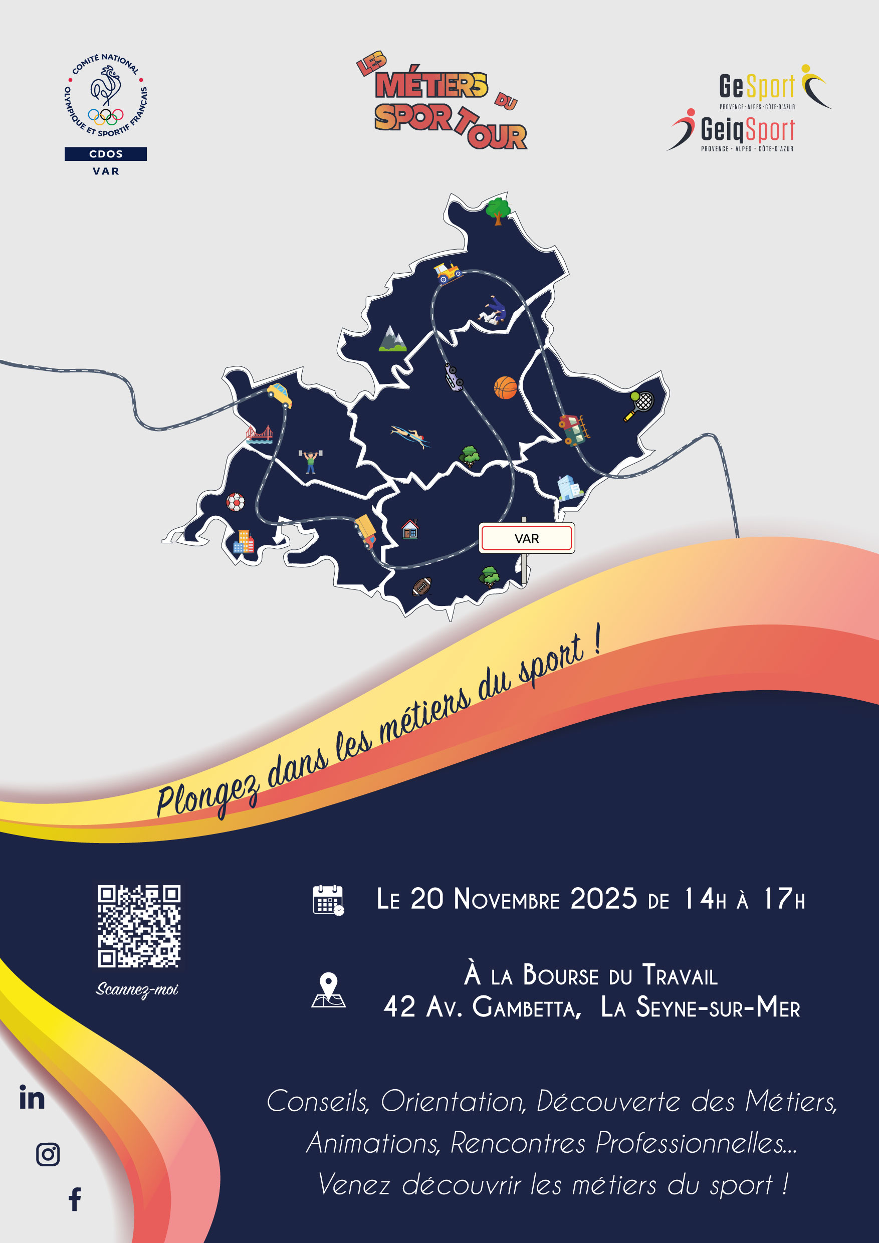Cette année, "Les Métiers du Sport Tour" feront halte dans le Var le jeudi 20 novembre 2025 à La Seyne-sur-Mer, à la Bourse du Travail (42 avenue Gambetta).