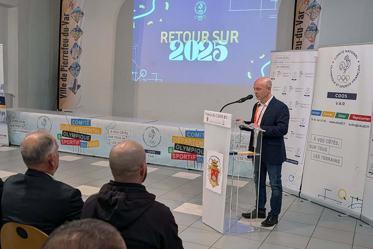 Devant des membres de 31 comités départementaux* et plusieurs représentants institutionnels (SDJES, inspection académique, gendarmerie, mairie de Hyères), le premier adjoint à la mairie de Pierrefeu Jean-Bernard Kiston a ouvert la soirée en adressant ses voeux aux présents mais surtout en indiquant l'importance que pouvait avoir le CDOS 83 : « Vous êtes un garant fondamental du mouvement sportif dans notre département. À travers toutes vos actions, vous jouez un rôle essentiel dans la promotion du sport, le soutien aux bénévoles et l'accompagnement auprès des associations. Vous contribuez à faire du sport un véritable levier en matière social (...). Soyez assurés que la ville de Pierrefeu restera un partenaire engagé à vos côtés » a déclaré celui qui était accompagné de Marc Benintendi (adjoint aux sports) et Lionel Poleska (conseiller municipal).